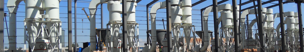 大塊物料經(jīng)顎式破碎機(jī)破碎到所需粒度后,由提升機(jī)送至儲(chǔ)料斗,再由皮帶機(jī)將物料均勻定量連續(xù)地送入6臺(tái)MTW175歐版磨的主機(jī)磨室內(nèi)進(jìn)行研磨。粉磨后的物料被風(fēng)機(jī)氣流送入選粉機(jī)進(jìn)行分級(jí),在選粉機(jī)葉輪的作用下,不符合細(xì)度要求的物料落入磨室內(nèi)重新碾磨,合格的物料則經(jīng)空氣斜槽進(jìn)入旋風(fēng)集粉器內(nèi),進(jìn)行分離收集,經(jīng)排料裝置排出即為成品粉體。