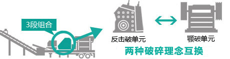 一種車身為4種機(jī)型通用,喂料單元互換系統(tǒng)、破碎單元互換系統(tǒng)和篩分單元互換系統(tǒng),只需再投資單機(jī)設(shè)備成本,短時(shí)間內(nèi),即可在同一車身上實(shí)現(xiàn)不同型號喂料單元互換系統(tǒng),反擊破與顎破互換系統(tǒng),不同型號振動(dòng)篩互換系統(tǒng),整機(jī)各系統(tǒng)之間的匹配,適應(yīng)場合更廣泛,破碎功能更強(qiáng),客戶的消費(fèi)品得到較大體現(xiàn)。該模塊中配置可選全車載皮帶機(jī)。